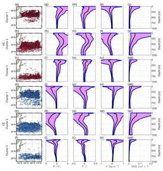 Vertical structure of mesoscale eddies is key to the eddy-induced heat/material transport that further affects the climate and marine ecosystem. This study explores the vertical structure of mesoscale eddies in the Kuroshio-Oyashio Extension region (KOE) and its underlying dynamics. By applying the hierarchical ascending classification to the observational and reanalysis data sets, we classify mesoscale eddies with three distinct kinds of vertical structures. Each kind of eddies exhibits clear spatial aggregation along a distinct zonal band. Eddies have core depths of 100–300 m in the northern part of the KOE and core depths of 300–500 m and 0–100 m in the southern. The eddy splitting or merging does not introduce new kind of eddy vertical structure but causes large intra-kind variability. The different kinds of eddy vertical structures can be partially accounted for by the baroclinic instabilities at the eddy generation sites and local adjustment process.