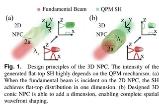 WeexperimentallyextendthenonlinearGaussiantofat-topbeamshapingfromonetotwodimensionsthroughathree-dimensionalnonlinearphotoniccrystal.Employinganear-infraredfemtosecondlaser,weinduceamodifcationinsidelithiumniobatetoachieveasecond-ordernonlin-earopticalcoefcientmodulationinthreedimensions.Thefat-toppedtruncationofwavefronthasbeenadjustedinamutualperpendicularcoordinateseparately.Amongthegeneratedfat-toppedbeams,theoptimalfatnessis97.1%,andthenonlinearconversionefciencyis10 atthepeakpowerof37kWwiththeinteractionlengthof630 µm.Byaddinganextradimension,ourworksimultaneouslyenablesfull-wavefrontfat-topdistributionandnonlinearfrequencyconversion.