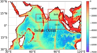Accurately and effectively estimating of the barrier layer thickness (BLT) is essential for the research of ocean thermodynamics, ocean dynamics, and air-sea interaction. Artificial intelligence model provides an effective means for accurately estimating BLT from sea surface and gridded Argo data. The present study focuses on the application of a hybrid particle swarm optimization-based artificial neural networks model (PSO-ANN) for estimating the BLT in the Indian Ocean. The input variables of the hybrid model include sea surface temperature (SST), sea surface salinity (SSS), sea surface height (SSH) and precipitation (P), and the output variable is the BLT value. Multivariate satellite and gridded Argo data collected from the Indian Ocean between January 2012 and December 2019 (i.e., a database consists 239,568 training datasets and 34,224 testing datasets) are provided to prepare the training and testing datasets for the model. The parameters of ANN model, such as network parameter, network weights, and dropout rates are optimized using the PSO algorithm to achieve the best estimation model. R-squared (R2) and root mean square error (RMSE) are used to evaluate the performance of the model. Two groups of comparative experiments (Case 1 and Case 2) on the performance of the PSO-ANN model demonstrate that the model in Case 2 can better capture the complex features of the BLT in the ocean region. The performance of the PSO-ANN model in Case 2 is further compared with the data-driven estimation models such as the traditional ANN model and the known multilinear regression model (MRM), as well as the CESM2-WACCM dynamic model from CMIP6. The comparison results show that the dynamic model has the worst performance among the four models. Moreover, the annual average RMSE value for the PSO-ANN model is 1.83 m, which is 12% and 84% lower than that of the traditional ANN and MRM, respectively. The R2 value for the model of 0.85 is improved by 4% and 40% compared to that of two models. Furthermore, three regions with significant seasonal fluctuations of the BLT in the Indian Ocean are selected to further evaluate the estimation accuracy of the hybrid model in 2019; the Southeast Arabian Sea (SEAS), the Bay of Bengal (BoB), and the Eastern Equatorial Indian Ocean (EEIO). As a result, the hybrid model is capable of reflecting seasonal variation trends in these regions, but there is room for improvement in the estimation accuracy. In addition, the correlation analysis between BLT and sea surface parameters indicates that there exist significant correlations between the BLT and SSS, P. The results of this study show that the proposed hybrid model can be used to estimate and analyze BLT in certain regions with complex ocean dynamics processes. Moreover, the model can be extended to estimate other key ocean parameters and provide effective technical support for studying the internal ocean parameters.