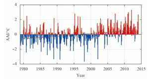 The Arctic near-surface air temperatures are increasing more than twice as fast as the global average–a feature known as Arctic amplification (AA). A modified AA index is constructed in this paper to emphasize the contrast of warming rate between polar and mid-latitude regions, as well as the spatial and temporal characteristics of AA and their influence on atmospheric circulation over the Northern Hemisphere. Results show that AA has a pronounced annual cycle. The positive or negative phase activities are the strongest in autumn and winter, the weakest in summer. After experiencing a remarkable decadal shift from negative to positive phase in the early global warming hiatus period, the AA has entered into a state of being enlarged continuously, and the decadal regime shift of AA in about 2002 is affected mainly by decadal shift in autumn. In terms of spatial distribution, AA has maximum warming near the surface in almost all seasons except in summer. Poleward of 20°N, AA in autumn has a significant influence on the atmospheric circulation in the following winter. The reason may be that the autumn AA increases the amplitude of planetary waves, slows the wave speeds and weakens upper-level zonal winds through the thermal wind relation, thus influencing surface air temperature in the following winter. The AA correlates to negative phase of the Arctic oscillation (AO) and leads AO by 0–3 months within the period 1979–2002. However, weaker relationship between them is indistinctive after the decadal shift of AA.